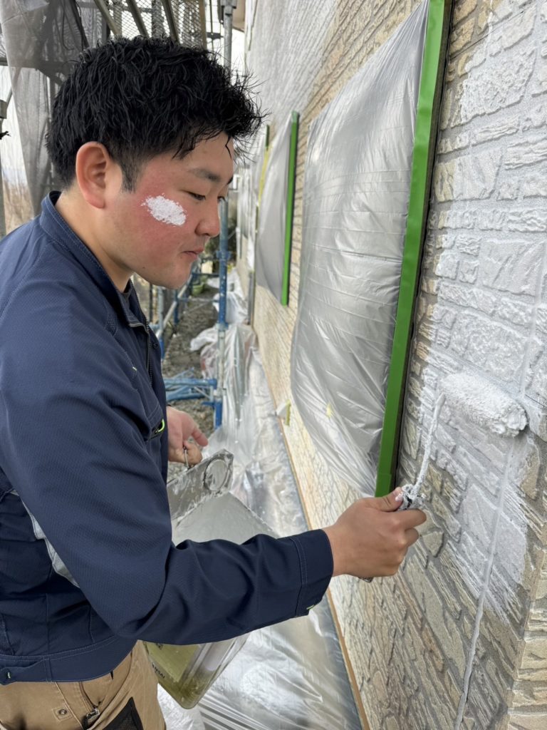 美寛建築の今松です!ビシバシ塗装させて頂いております!ちなみに1番大事な下塗り中です。